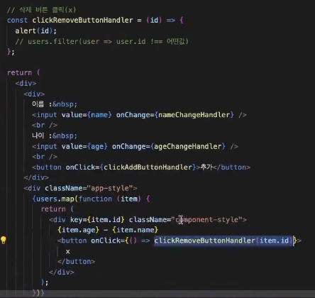 <button onClick = {() = > clickRemoveButtonHandler(item.id)}> // 바른코드