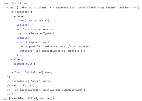 onAuthStateChange를 유저로그인 상태 파악으로만 사용하고 따로만들어 둔 실제 사용하고 있는 User Table을 읽어온다.